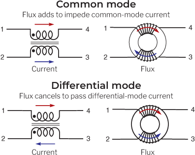 In common mode, the current in a group of lines travels in the same direction so the combined magnetic flux adds to create an opposing field to block the noise, as illustrated by the red and green arrows in the toroid core shown in Figure 1. In differential mode, the current travels in opposite directions and the flux subtracts or cancels out so that the field does not oppose the normal mode signal.